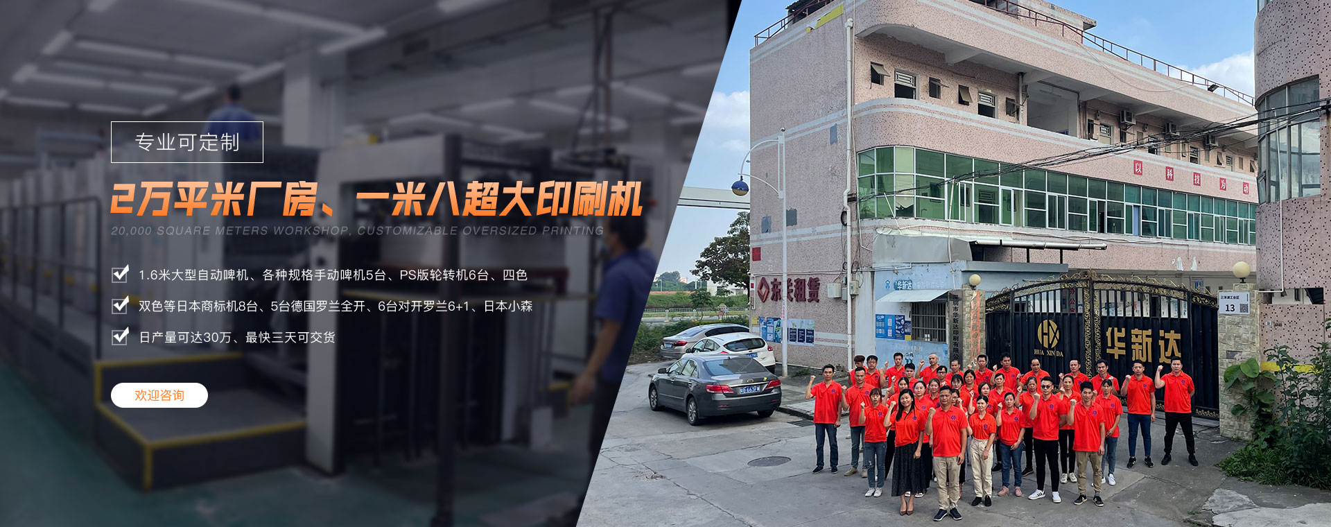 深圳市華新達印刷有限公司成立于1998年,是一家專業生產各類特大彩箱、彩盒、燈管盒、彩標、畫冊,說明書,貼紙,卡牌等各種印刷包裝產品的現代化包裝印刷企業,在新老客戶的大力支持和全體員工的不懈努力下,公司規模不斷壯大,現有職工一百多人,現代化的廠房13000多平方米,年產值達1億人民幣。